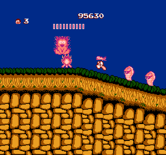 Despite the life ruining difficulty, Adventure Island is good. Really good. It’s a master class in design – Adventure Island is genuinely some of the smartest level design I’ve seen in any game, bar none. If you’re a budding game dev who has any interest in making a platformer game, I strongly urge you to play through this game. It’s clear that the developers watched people playtest their game, took note of the most common patterns of play they saw unfold, and went back to the drawing board to fine-tune each level into an experience that’s either built around fluffing up the players ego with an easy breezy easy win, or breaking them down with sneakily placed enemies and obstacles until there’s naught left but dust and tear ducts. Need I remind you that Adventure Island exists to make you go bald from stress? No? Good.