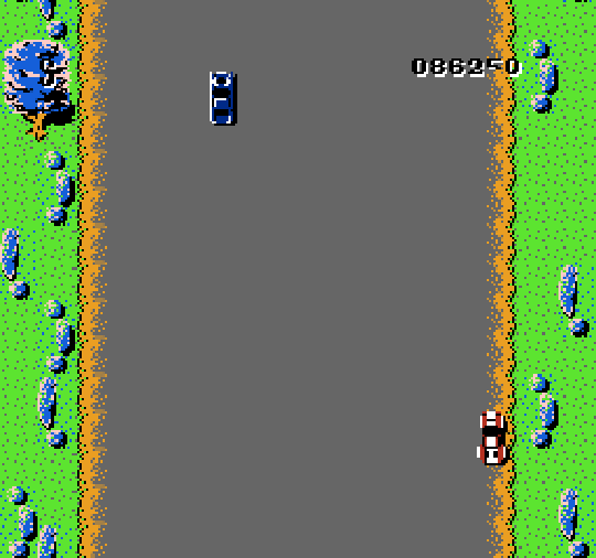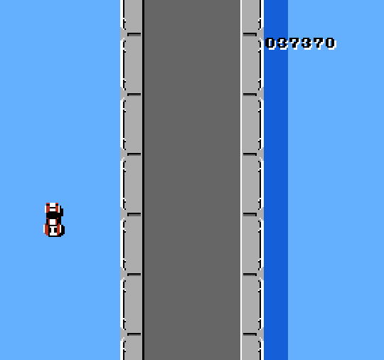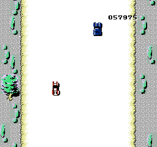 It’s really difficult. I wasn’t entirely joking when I said that Spy Hunter zips along at the speed of sound; the screen moves at a blisteringly fast pace. The arcade original looks much more manageable in terms of speed, so someone over at Sunsoft must have made the conscious decision to make the NES port run like its got somewhere to be. There are obstacles aplenty in your way, and you die in one hit (unless you have a precious 1-UP stocked, which are difficult to come by). It’s a game that asks for a lot of concentration, memorization, and pattern recognition from the player, and if you’re not up to the task, you may as well hand in your spy license now rather than embarrass your sorry self in front of Q later. There’s also no Pause button, so go pee and ensure your nose doesn’t need scratching before settling in for a night on the couch with Spy Hunter. There’s no getting off this crazy highway once you start ’til you’re dead, which is a pretty good metaphor for life, probably. I don’t know.