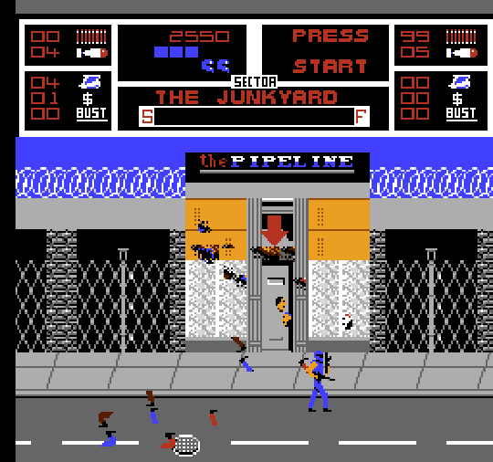 Not counting the obvious downgrade of graphics and sound, the NES port of NARC is surprisingly faithful to the arcade original. The bloody limbs and severed heads somehow squeaked past Nintendo’s censors, as did running over crackheads with your Porsche as you do 100 down the freeway. Direct references to drugs have technically been scrubbed, but even with these changes, it doesn’t take a genius to figure out what a hippie themed greenhouse full of nondescript green plants is supposed to be. Most surprising has to be the fourth level, in which buildings that say things like “TOPLESS” and “ADULT BOOKS XXX” set the scene for being stabbed to death by Kinky Pinky the Clown. The prostitutes didn’t make the cut, though. So it goes.