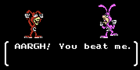 Of interest is that Yo! Noid is actually an elaborate reskinning of a pre-existing Famicom game called Kamen no Ninja Hanamaru. Hanamaru is the same game in essence, but with a feudal Japanese coat of paint. The love and attention the original title was shown by its creators would explain why the Noid edition actually turned out to be pretty cool. A leftover from Hanamaru is the unorthodox approach to boss battles; rather than a traditional fight against a big baddie, the Noid is accosted at the end of every odd-numbered level and forced to participate in a “pizza eating contest” with another Noid. As the Noid’s one and only character trait is that he hates pizza with all of his heart and soul, one can only assume this is designed as a torture method to make the Noid’s life a living nightmare. But if we had to stop and unpack each and every time the Noid’s life felt like a living nightmare, this post would never end.