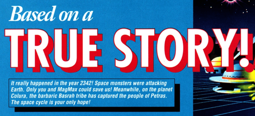 The plot of Seicross is a simple one: the Petras (the blue bean-shaped boobah looking guys seen above) and the Basrah (scooter grandmas) are at all-out war. The Petras are peace loving pacifists, and get curb stomped so hard that they all go into hiding at the first sign of trouble. The ones that didn’t flee are captured as P.O.W.’s – and this is where YOU come in! The game’s manual can’t seem to decide whether or not it’s the player character or the bike he rides that’s called “Gilgitt Petras”, but either way it’s one of the worst names in recorded history, and he’s the guy that the player needs to guide to absolute victory. Or to save the prisoners. Or something. Either way, the flyer for the arcade version boldly claims that this is all “based on a TRUE STORY! … It really happened in the year 2342!” so it was considerate of them to give us a few centuries to prepare for all of this geriatric space madness.