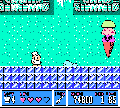 You can feel that certain je ne sais quoi NES-era Taito was known for in every last pixel. Chef Cookie controls like a dream, and there are rare few instances the game feels unfair. There are silly weapons to make use of and spice up your experience throughout – a spoon for longer range, plates for throwing, and sporks to pogo stick around on. Every level’s graphics are lively and make use of pleasing pastel palettes throughout, and every foodstuff enemy is bursting at the seams with humour and panache. The soundtrack is one of the best parts of an all-around excellent experience – each level’s track is poppy and well composed, making top tier use of the NES’s sound capabilities. I really don’t have a bad thing to say about Panic Restaurant. It’s mighty tasty!