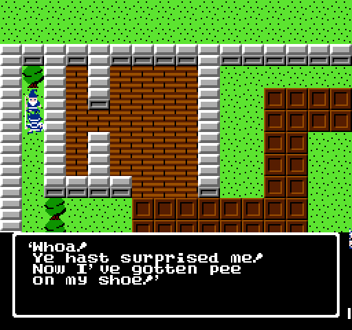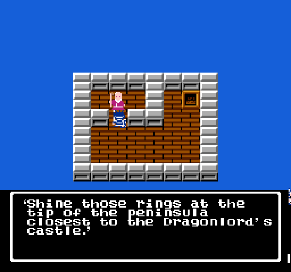 While you’re still in Lotoresia, there’s one last important stop to make. Head on over to the upper west-most part of town, one screen above the inn. Go down the flight of stairs, and use the Magic Key to unlock the door in front of the old man. He’ll tell you some plot stuff, and also how to get to the Dragonlord’s cavern! You need to use the princesses’ rings at the tip of the peninsula closest to the Dragonlord’s castle. Good to know.
