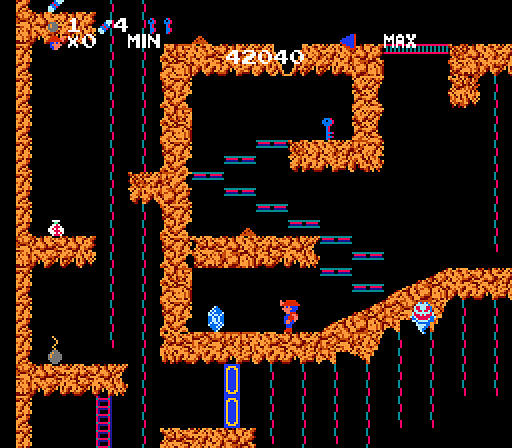 The thing about Spelunker that tends to send most people sour is the fall damage. If Mr. Spelunker falls any further than a few centimetres, he dies so fast that his ass literally doesn’t have time to hit the ground, frequently resulting in more than a few weird mid-air deaths throughout. This infamously happens to most first-time players in the first few seconds of playing, to the point where the BGM feels like it was intentionally composed to flow seamlessly into the “you died” jingle. It’s an understandably hard and somewhat embarrassing adjustment to make for most, who then go on to write off Spelunker as little more than trash.
