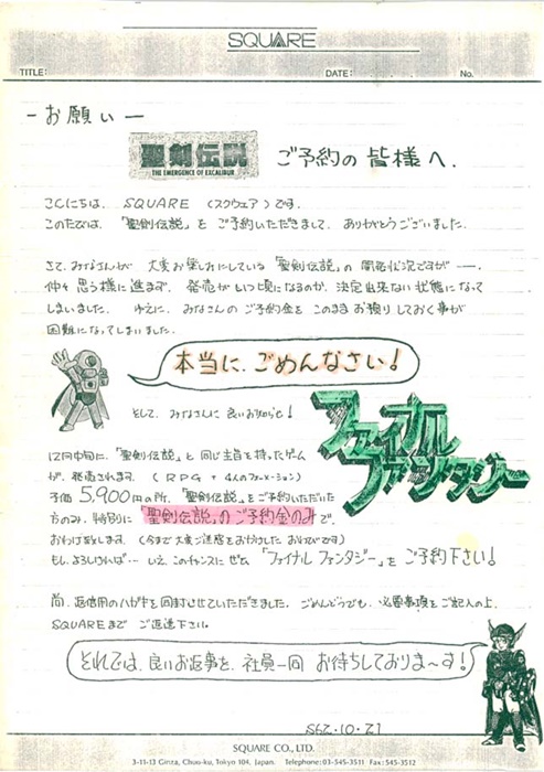 Seiken Densetsu (known as the Mana series in English) was originally set to get its start on the Famicom Disk System back in 1987. Titled Seiken Densetsu: The Emergence of Excalibur, the game was set to be a whopping five disks in size, and promised to span several generations worth of characters and gameplay. By the way, Hironobu Sakaguchi was working on this game as a staff member as well. At the time, Square was teetering on bankruptcy and couldn’t keep up with the level of ambition Seiken Densetsu was trying to bring to the table, and cancelled the game before much work could be done on it. Thanks to their financial woes, Square had jumped headfirst into soliciting pre-orders of the game despite having almost nothing to show of it, which meant they had some ‘splaining to do once the cancellation was finalized. Staff members sent out handwritten letters to those who had pre-ordered Seiken Densetsu which, alongside an apology for the cancelled game, included what was essentially a sales pitch for a certain other title…
