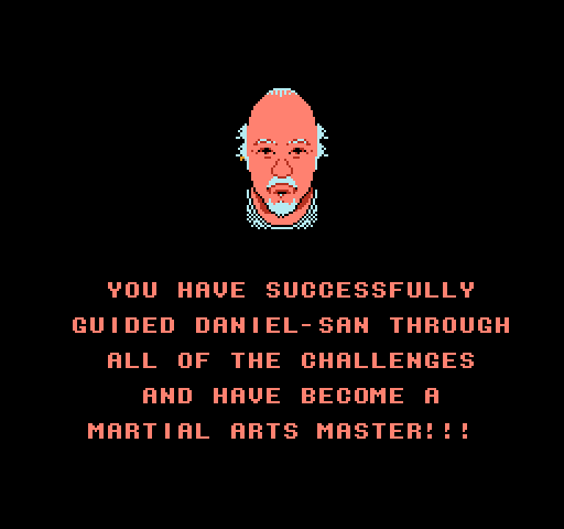 Rather than being a unfairly maligned hidden gem or a total shitload of fuck, The Karate Kid is totally, irrevocably middling. Like room temperature water, or a cracker that’s just about to go stale, but hasn’t yet. Not very anger inducing, but far from satisfying. If the game was any longer it’d definitely cross into irredeemable territory, but the fact that this thing can easily be finished in an hour by just about anybody – even less than that if you’re halfway decent at action games – is a big point in its favour. It may be worth checking out if you’re starving for a quick NES clear, but there are plenty of better titles out there to spend your time on. If you can’t live without a NES movie tie-in…I dunno, maybe give Jaws a try instead. I thought Jaws was pretty okay.