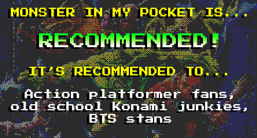 The game is a standard action platformer of the time, though it’s been blessed with the privilege of being a 1992 NES release. In other words, the music and graphics are more satisfying than getting a full-size chocolate bar dropped in your trick or treat bucket. Monster in my Pocket’s music is so great, in fact, that K-pop sensation BTS got called out for ripping it off last year. No, really!