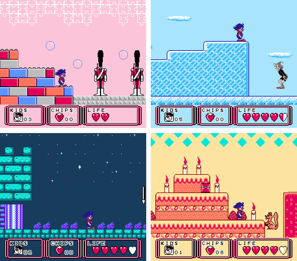 All great video game heroes have an iconic weapon. Kid Klown’s is a bunch of balloons. But these balloons are used for so much more than defeating enemies, oh yes! Kid Klown uses them to jump extra high, hover in the air like Tanooki Mario, and even scale waterfalls that flow upwards (it’s a dream world, don’t think too hard about it). However…the level design doesn’t make use of the balloon’s potential for some potential fancy platforming. Each of Kid Klown’s levels tend to only have one or two jumps that incorporate the balloons, leaving them feeling sorely underutilized.