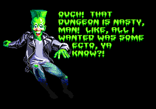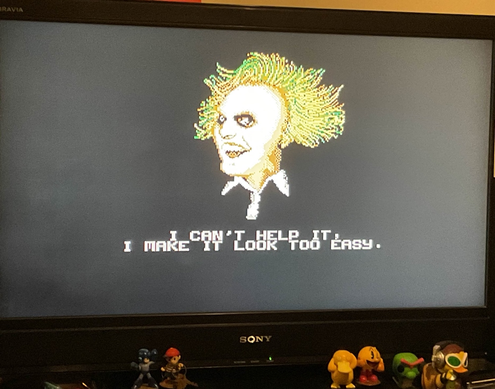 Let’s end this review on a positive. If you want to play a good Beetlejuice game, I recommend Haunting Starring Polterguy on the Sega Genesis. In that game, you play as a recently deceased punk who has to scare the yuppie family responsible for his death out of their home using intricate traps, strategy, and ‘tude. As it was the 90’s, the ‘tude is very important, and is reflected in the many many many scares used to frighten the bejeezus out of the snotty family. Polterguy can do gnarly things like possess a housefly, blow it up to human size, and give it the head of the bratty daughter to send the mother inching ever closer to a full-on mental breakdown. No animation is ever used twice throughout the entire game, so there are hundreds of these to see over the course of a playthrough! Even if the aesthetics aren’t in line with the Tim Burton flick, this unrelated title is an infinitely better Beetlejuice game than the Beetlejuice game we actually got. In this instance, Genesis truly did what Nintendon’t.