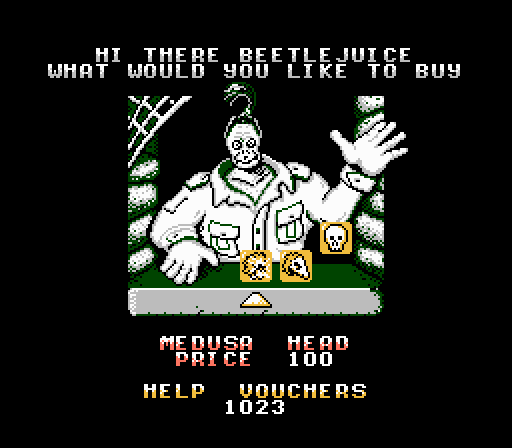 No great game is complete without a designated “bug squish” button, and Beetlejuice is no exception; the B button performs this hideous task with a stomp of Beetlejuice’s weathered shoe. He can’t kill actually dangerous enemies with the wimpy stomp, but he can squish these harmless little bugs in exchange for help tickets. These tickets act as currency in the shops. Each bug kill nets you anywhere between 10 and 75 tickets. You need upwards of 500 to acquire one “scare” from the store. Scares are these sad excuses for power-ups that fade after you throw 3-4 projectiles, or every time you get hit, whichever happens first. These power-ups are needed to kill the end of level bosses, and you’ll be needing a lot of them to do away with the baddies in one try. Put another way, currency grinding is a key mechanic in this already frustrating platformer. Does the fun never begin?