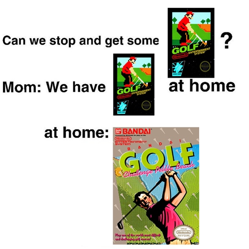 NES Open Tournament Golf and Golf Grand Slam are the only must-play golf games for the North American NES. Golf and Lee Trevino will scratch any 8-bit golf cravings you may be unable to satiate with the previous two games, but aren’t worth going out of your way to track down. If you don’t mind a piece of unsolicited financial advice, I’d recommend not blowing your hard earned money on cartridges of Bandai Golf, Greg Norman or, God forbid, Jack Nicklaus. Not worth frittering away your precious time via emulation, either. Buy a snack and watch some “best of” golf plays from the 80s instead. Or grab a friend and hit the nearest mini-golf course near you. It’s pretty fun on a warm day with a nice drink and people you like.