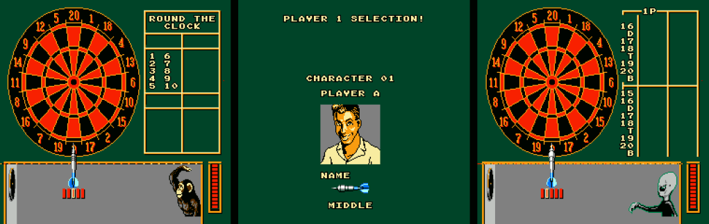So obviously none of that is true. Magic Darts on the NES is a basic dart game with basic game modes and basic gameplay. The titular magic comes not from the worlds most famous magicians one-upping each other at bar games, but instead from the fact that you can play as a monkey, an alien, a ninja, or a robot alongside normal human characters. If you enter your player name as “SEX,” you can be a weird robot/alien/Leonard Nimoy hybrid, if you feel so inclined. Each of these funky characters has a trick shot that triggers once in awhile. A round typically isn’t longer than five minutes. There are other game modes, but they’re all about as short and droll as each other. Shock and awe, there’s no story mode or anything resembling progression. For a game that released in the same month as the Super Nintendo launched in North America, the lack of content is pretty inexcusable.